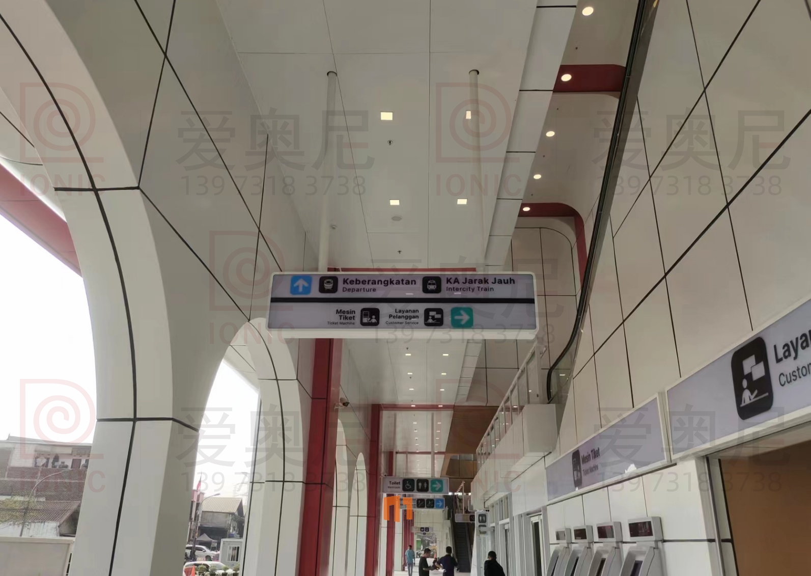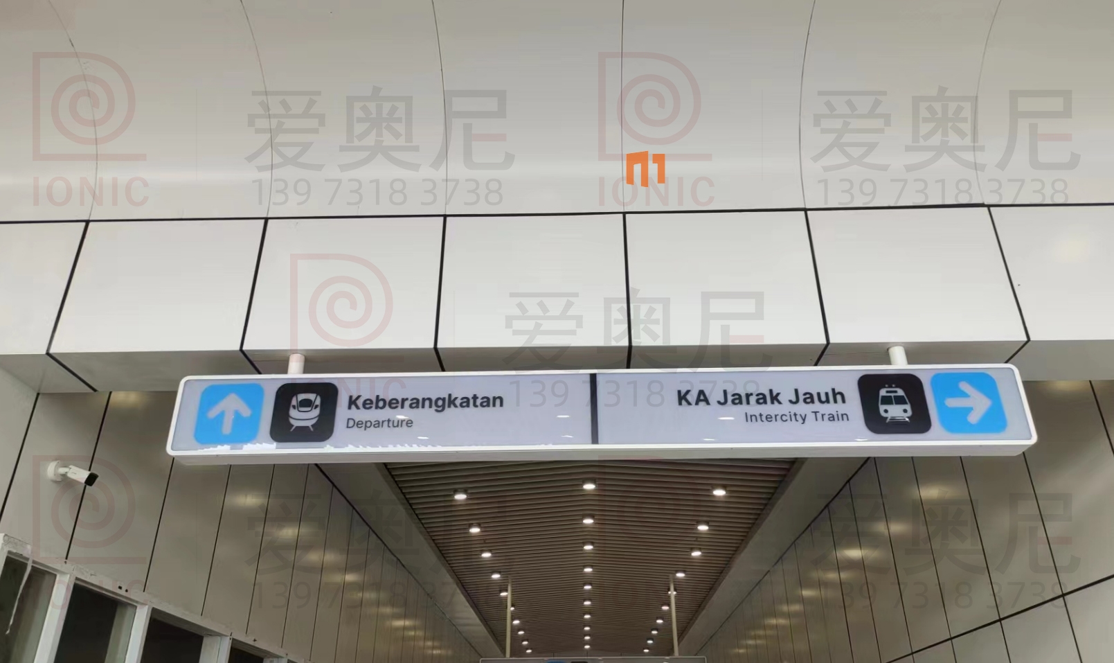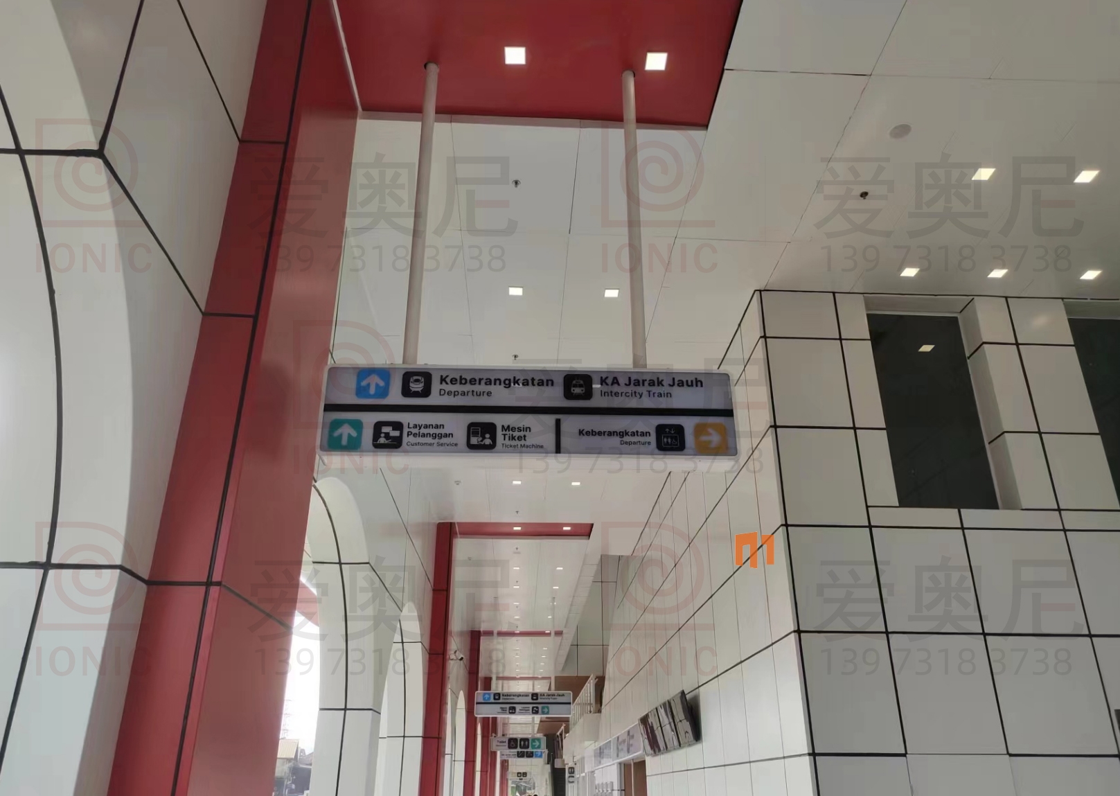 下圖是愛奧尼標識公司為印尼雅萬高鐵帕達拉郎站制作和安裝指導服務的靜態標識。客戶對項目制作工藝非常滿意。湖南愛奧尼標識工程有限公司是一家專業的鐵路標識,導向標識,高鐵站標識,站房標識,靜態標識設計制作安裝服務公司,擁有15年標識設計經驗,100多名專業生產團隊,獲得ISO9001質量管理體系認證等數10項榮譽資質證書,電話:400-0731-050,13973183738